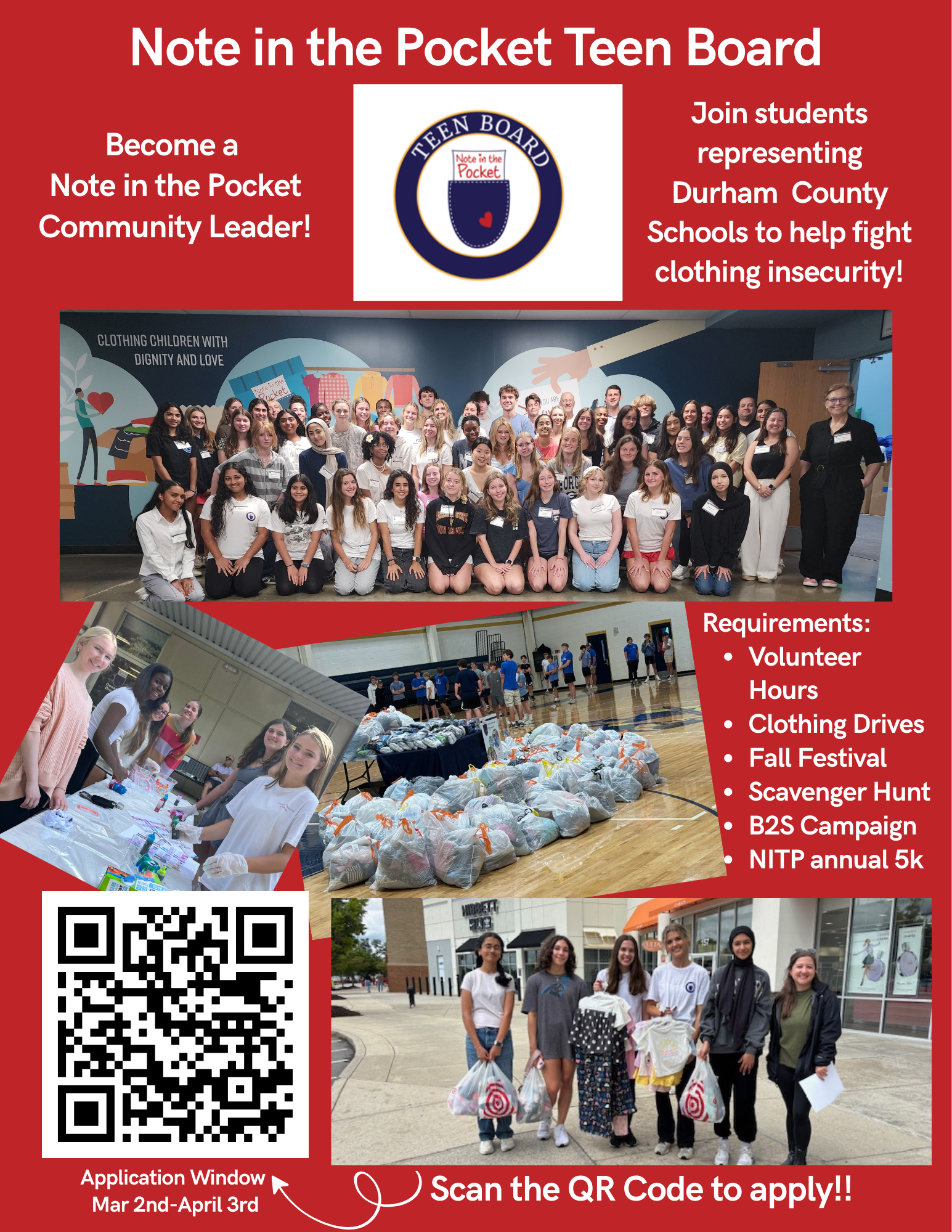 The application window will be March 2nd - April 3rd. Below I have a flyer attached that can be sent to students and parents which contains a QR for Teen Board applications . If you have any further questions please contact Kristina Isaac (kristina@noteinthepocket.org), or Mica Lloyd (mica@noteinthepocket.org).
