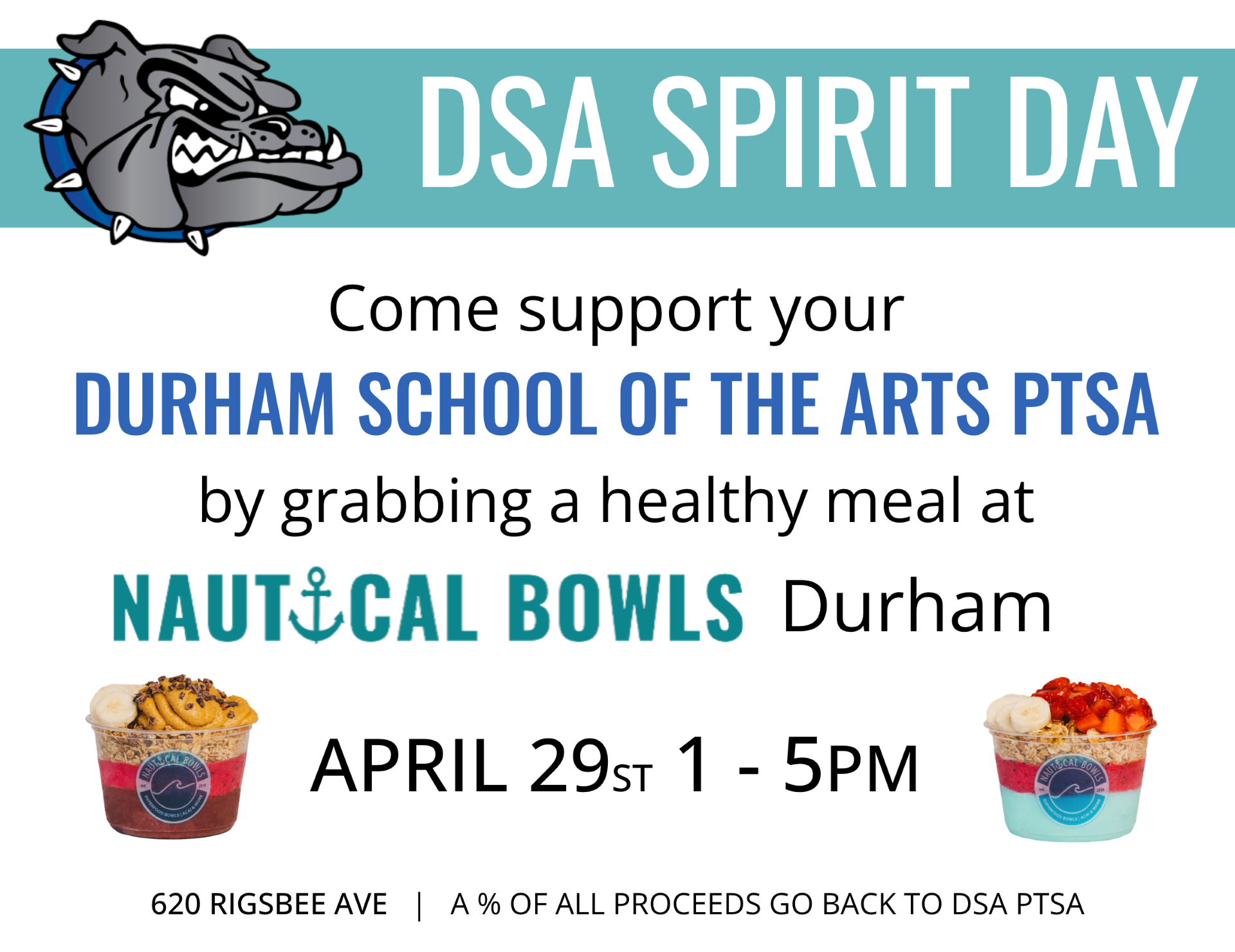 El miércoles 29 de abril, después de la salida a la 1 pm, visite Nautical Bowls, ubicado a poca distancia del campus. ¡El 15% de las ventas se destinará a DSA PTSA! |